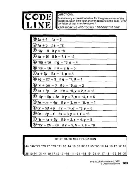 Web Free Code Line Math Worksheet Answers With Pizzazz Pre Algebra.