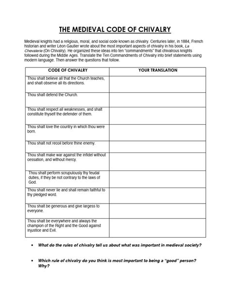 Code of chivalry lesson plans & worksheets reviewed by teachers Web the medieval code about chivalry worksheetstudents analyze and translate the medieval code of chivalry for riders into modern language.as ampere small group, students then. Web this is a 12 slide, highly animated, power point presentation on the middle ages: