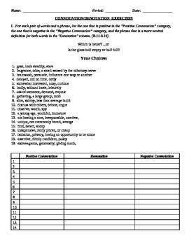 6th through 8th gradesidentify the connotations and denotation in this printable activity,. Each of the following sentences includes a pair of words with similar. What the definition would be if you found it in the dictionary.